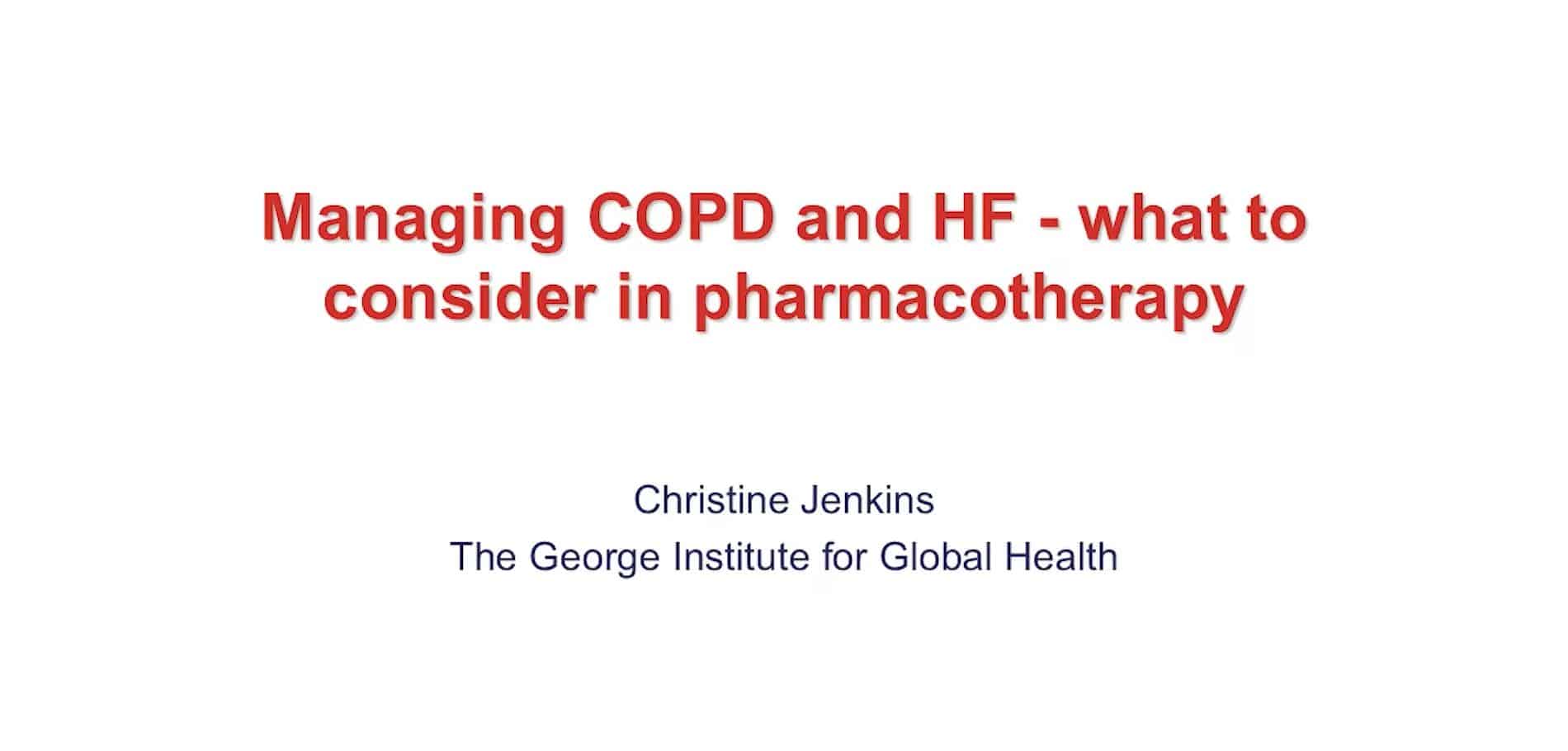Professor Christine Jenkins presents the latest data and guidance relating to managing COPD and heart failure, focusing on Managing COPD and Heart Failure – what to consider in pharmacotherapy